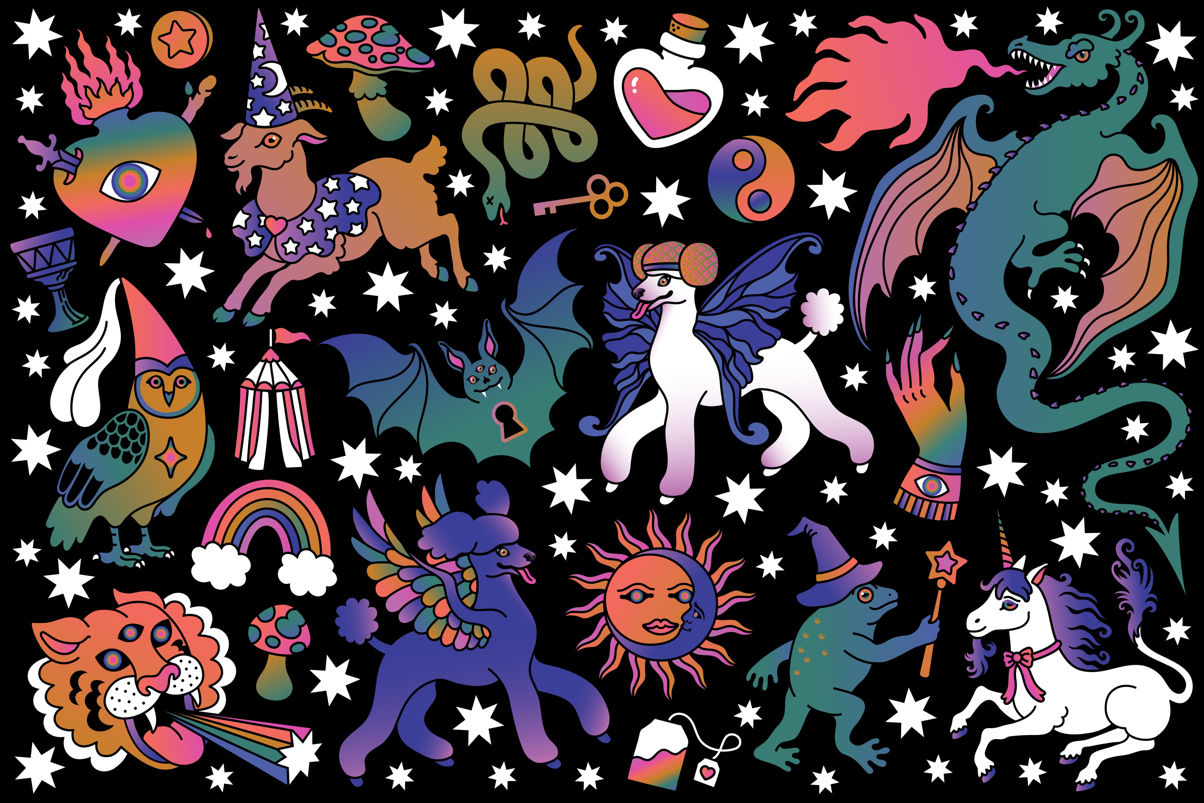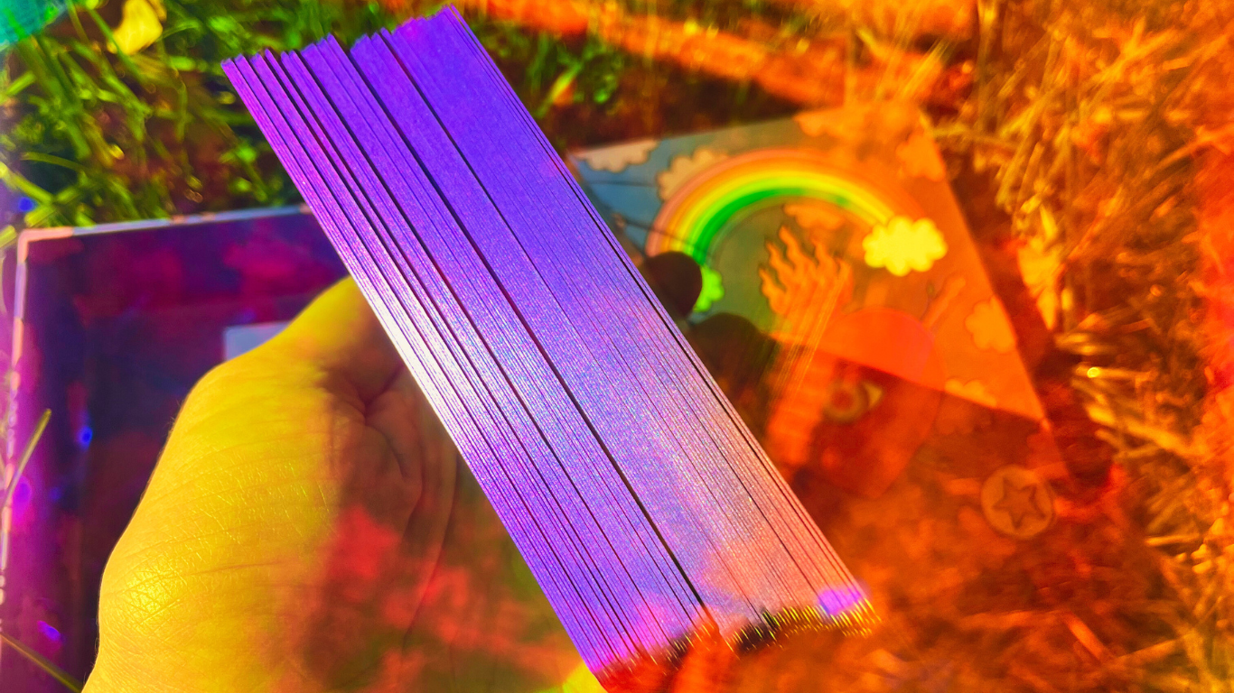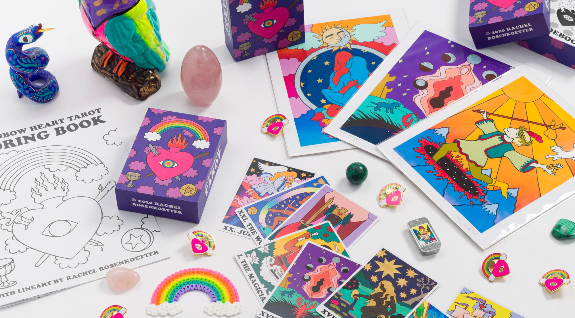 Now in its Fifth Edition, the Rainbow Heart Tarot is a groovy 78-card Tarot deck featuring colorful retro acrylic gouache illustrations that emphasize readability, diversity, and emotional honesty. Now with amethyst foil card edges!
