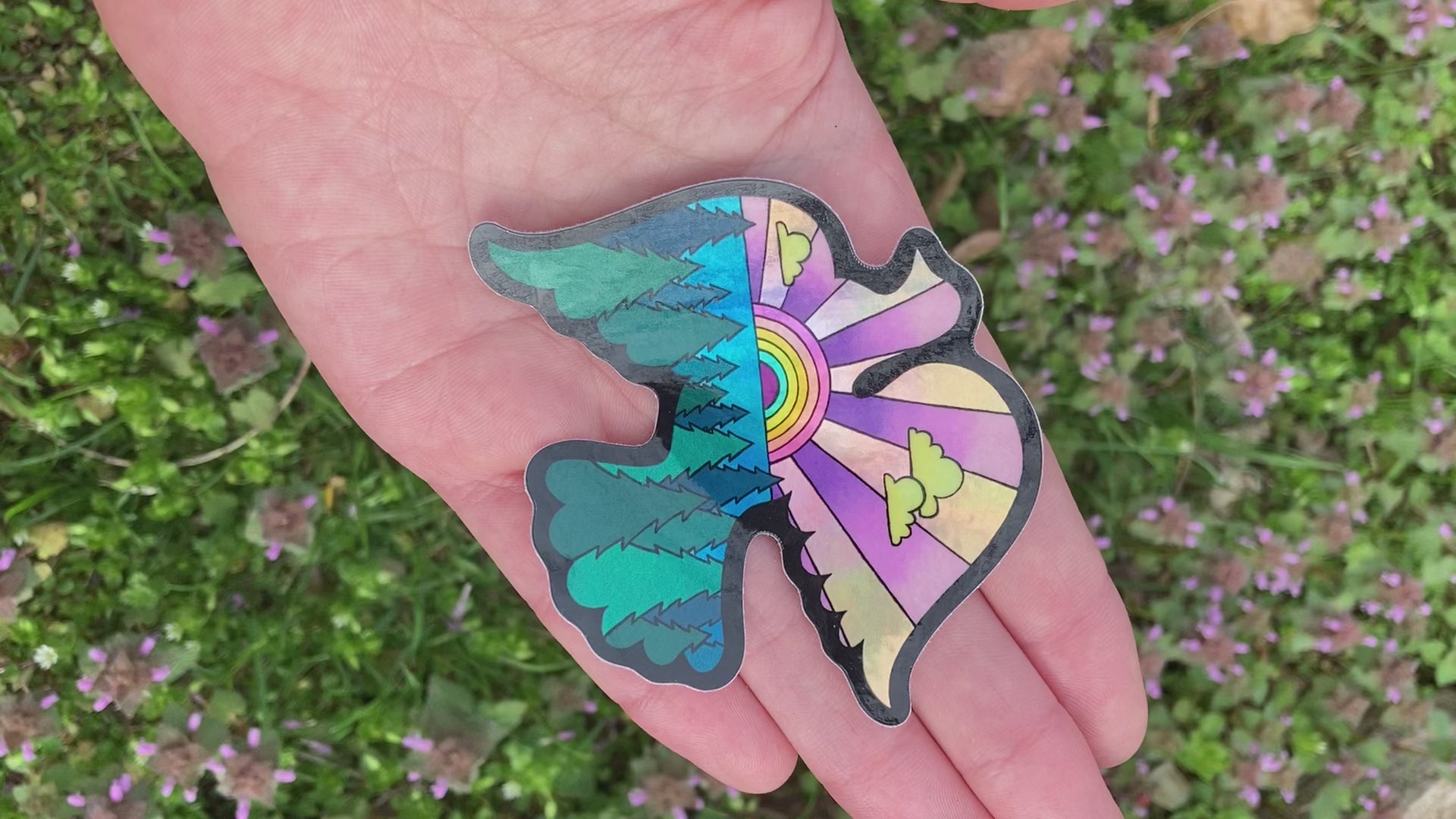 This 2.75x3.5" Peace Dove sticker features a bold rainbow holographic finish. This groovy little cosmic messenger contains a retro landscape scene complete with a rainbow sunset over a calm lake and evergreen forest.