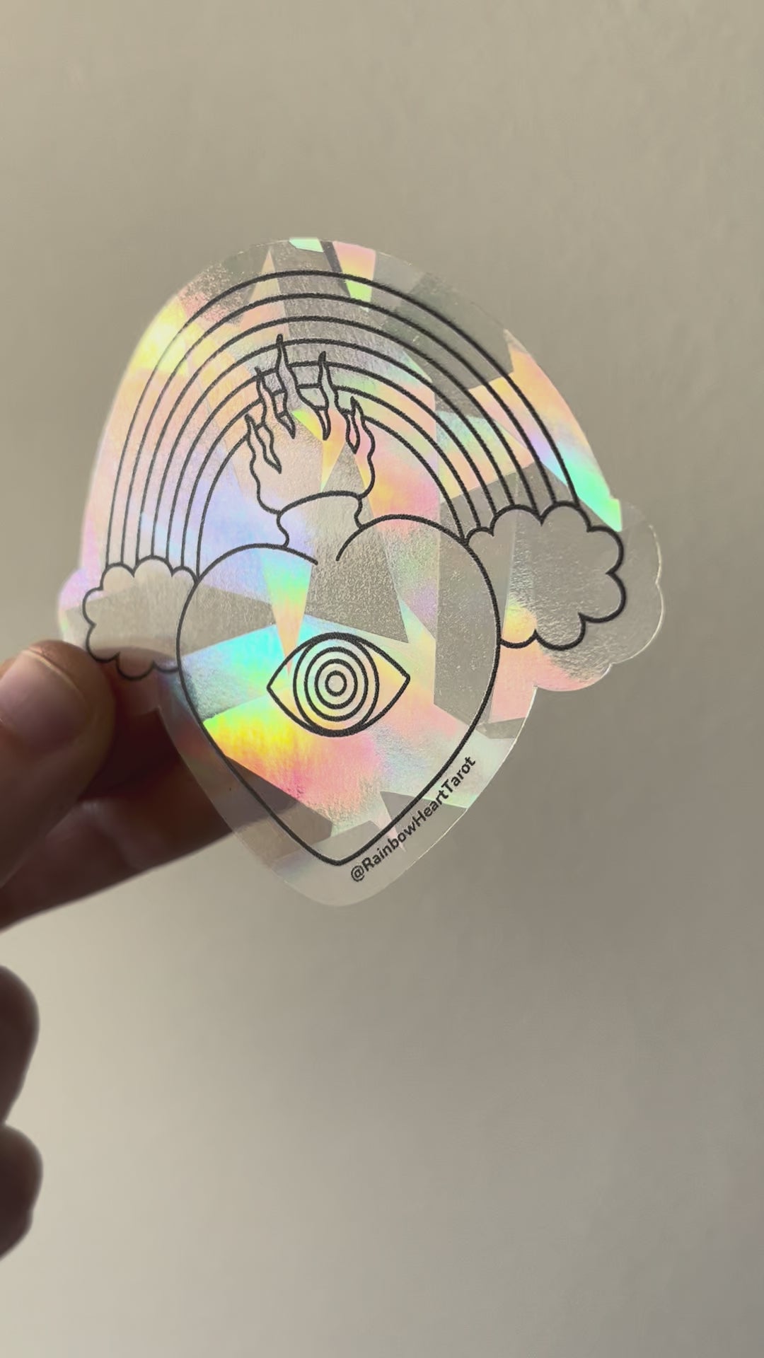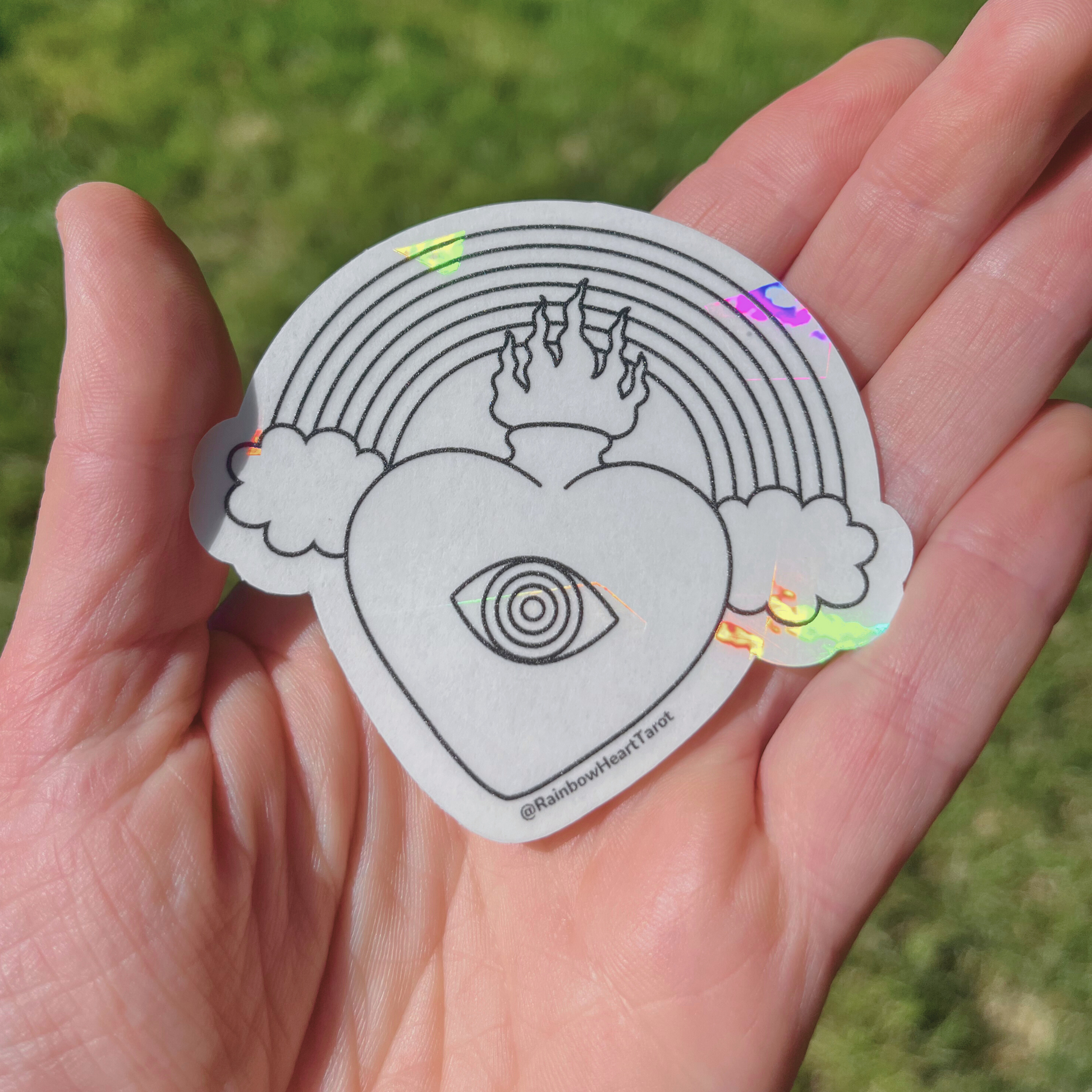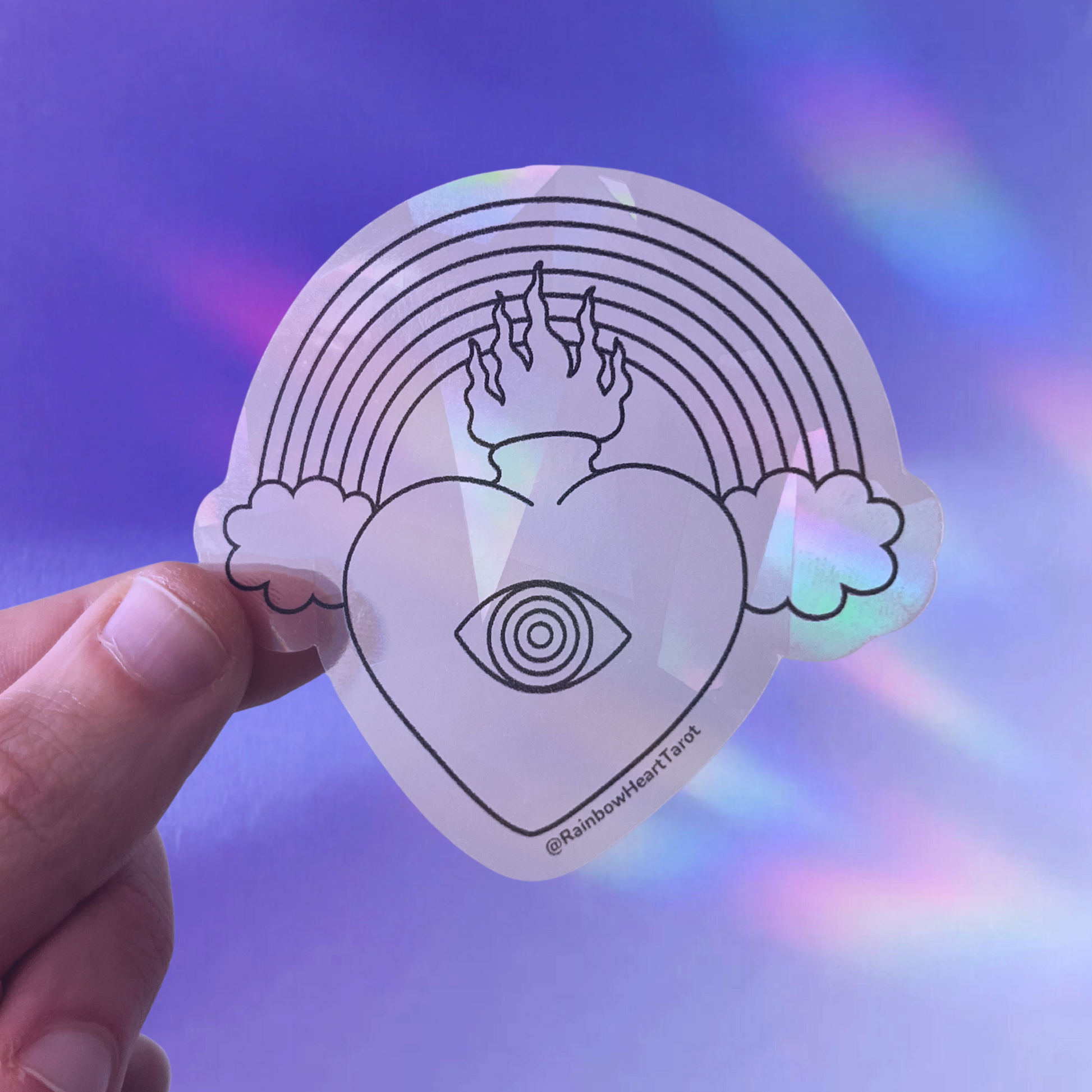 This 3 x 2.7" Rainbow Heart Tarot suncatcher sticker features a transparent cracked ice finish.