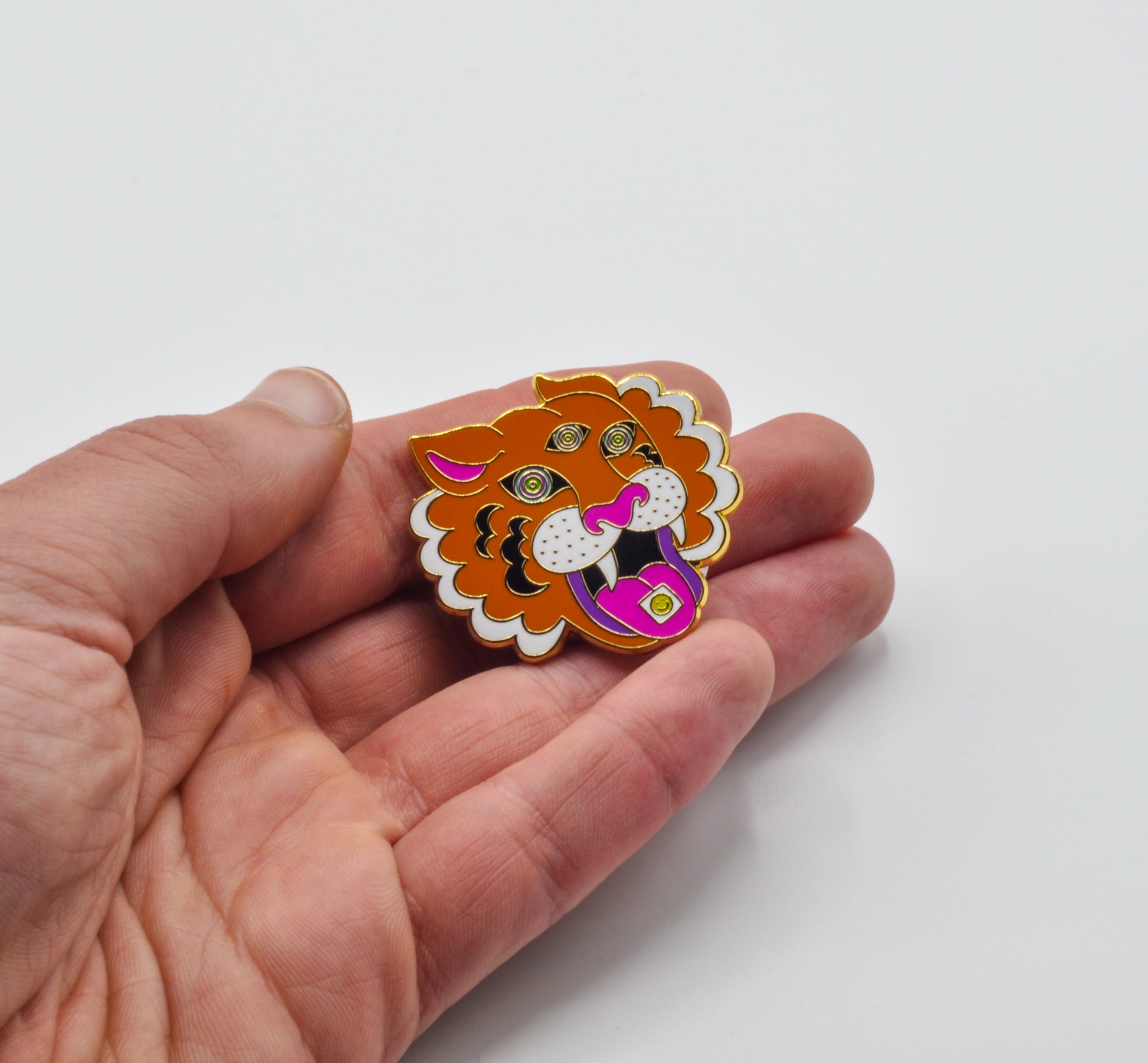 The perfect travel companion for your cosmic adventures, this 2” cloisonné hard enamel pin features vibrant colors, gold detailing and butterfly clutch backing. This psychedelic big cat has a blotter paper on his tongue and his third eye wide open.